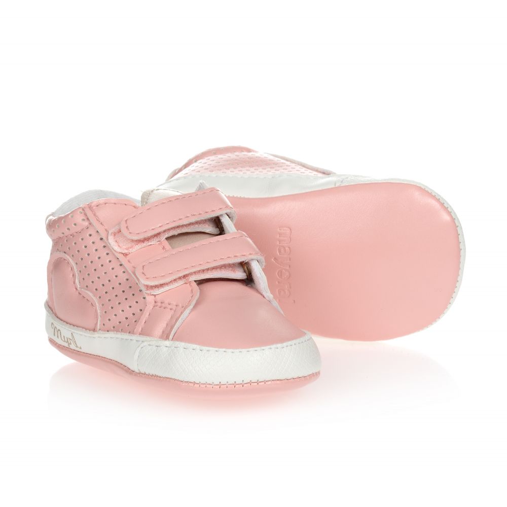 Pink pre-walker trainers for baby girls by Mayoral Newborn, with pearlised pale gold trims. They are made in soft faux leather and have velcro fastening straps.