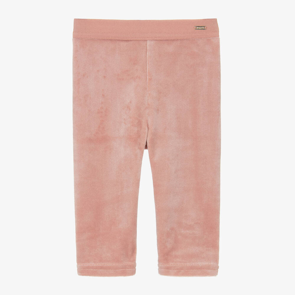 Dusky pink, full length leggings for baby girls by Spanish brand Mayoral. Made from soft velour, these comfortable leggings have a gently elasticated waistband trimmed with a dainty, gold-tone logo charm for designer appeal.