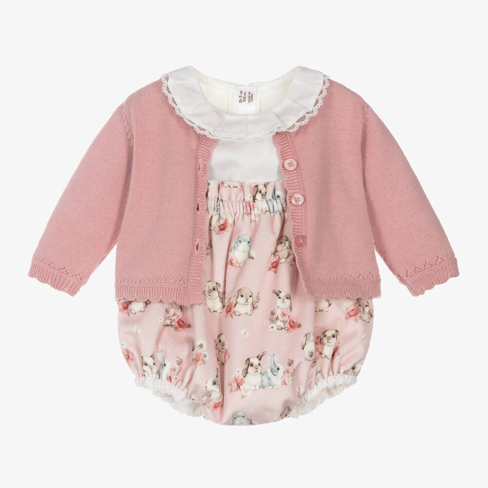 Dusky pink and ivory shorts set for baby girls by Mayoral. Made in a soft knit, the viscose-mix cardigan has lovely scalloped edges, pearlescent buttons on the front, and openwork detailing. The blouse, in lightweight cotton poplin, has a beautiful ruffle collar with a lace trim. The cuffs are elasticated and the back secures with buttons. With an adorable bunny rabbit and floral print, the cotton-lined velvet shorts have elasticated trims and adjustable, button-fastening shoulder straps.