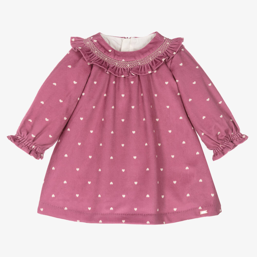 Purple velvet dress for baby girls by Mayoral, in a sweet ivory heart pattern. Lined in soft voile for comfort, it has a pretty ruffle collar with traditional smocked detailing. It has a shiny charm near the hem and fastens with a smooth, concealed zip on the back.