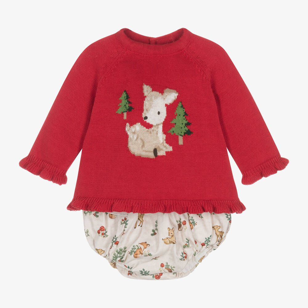 Sweet red and beige shorts set for baby girls by Spanish brand Mayoral, made in comfortable cotton. The long-sleeved, knitted sweater has an adorable, fluffy deer intarsia on the front, with embroidered details. Soft and lightweight, it has frilly, ribbed trims and fastens with buttons on the back. The pretty woodland print shorts have a deep frill on the sides and back, with a gently elasticated waistband and cuffs. They are fully lined for comfort. A pair of red tights completes the set.