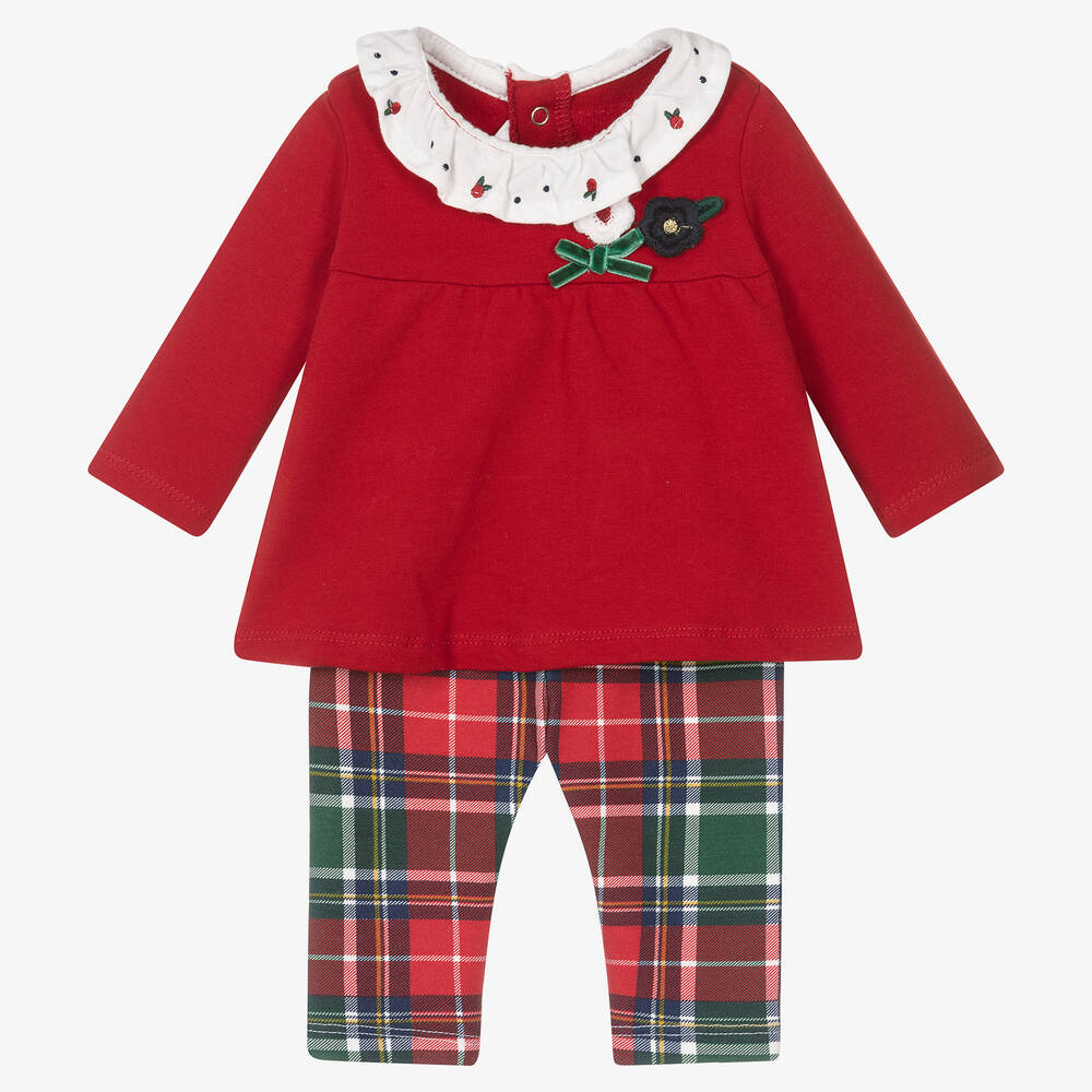 Red tartan leggings set for baby girls by Mayoral, made from soft and stretchy cotton jersey. Fastening with poppers on the back, the long-sleeved top has a white ruffled collar with pretty floral embroidery. There are white and navy blue flower appliqués on the chest with a green velvet bow. Completing the outfit, the classic tartan leggings have an elasticated waist for a comfortable fit on tiny tummies.