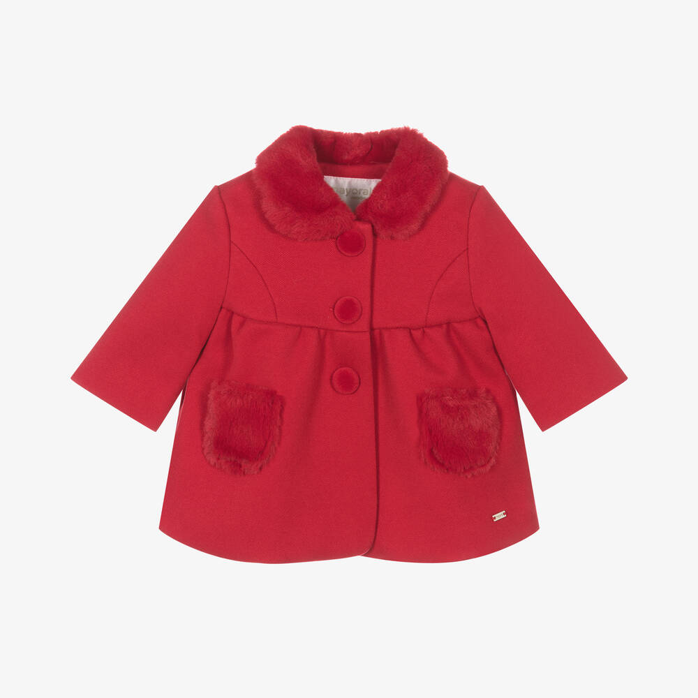Traditional red trapeze coat for baby girls by Mayoral Newborn, lined in beautifully soft plush. Lovely for keeping little ones warm on colder days, it is made in a soft viscose-blend fabric with a brushed feel. There are velvet-covered button fastenings on the front for a classic style. A fluffy plush collar and adorable plush pockets complete the look.