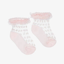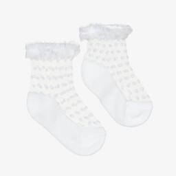Sheer white socks for baby girls from Mayoral, ideal for adding an elevated touch to any outfit. These pretty socks feature a flocked mesh upper complemented by a delicate, ruffled tulle cuff. The sole is made from a soft and stretchy cotton blend, ensuring comfort for little feet.