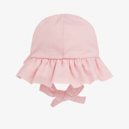 A lovely white sun hat for baby girls by Mayoral, woven in a soft cotton and viscose blend. It has a ruffled brim and a pretty bow on the back. Fully lined for comfort, it fastens neatly under the chin with adjustable ties.