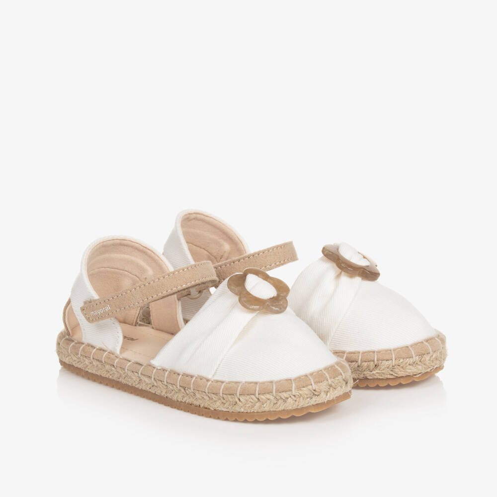 White and beige canvas espadrille-style sandals for baby girls designed by Mayoral, with a cute resin flower and gathered detail on the front. Comfortable for warmer weather, the upper, lining and padded insole are woven in a soft cotton mix. These cute shoes have easy-fastening velcro straps on the ankle and classic stitching around the woven hessian midsole. The rubberised soles are treaded to help improve grip.