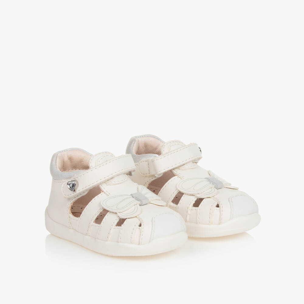 White first-walker shoes for baby girls by Mayoral, made in soft leather. These cute shoes have a butterfly appliqué on the front and a glittery silver padded trim on the back of the heel. They fasten with a velcro strap across the foot with a heart-shaped silver and jewel trim and they have an embossed logo on the heel. Lined with soft leather, they have a lightly cushioned leather insole for comfort and flexible, non-slip rubber outer soles.