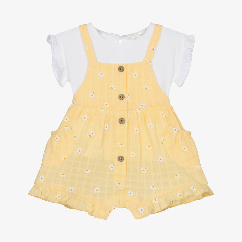 In yellow and white, this pretty cotton dungarees set for baby girls is by Mayoral. The jersey T-shirt has ruffle sleeves and a keyhole button fastening on the back. Patterned in white daisies, the shorts have decorative wooden buttons on the front and are elasticated around the back. There are patch pockets and ruffles around the hem.