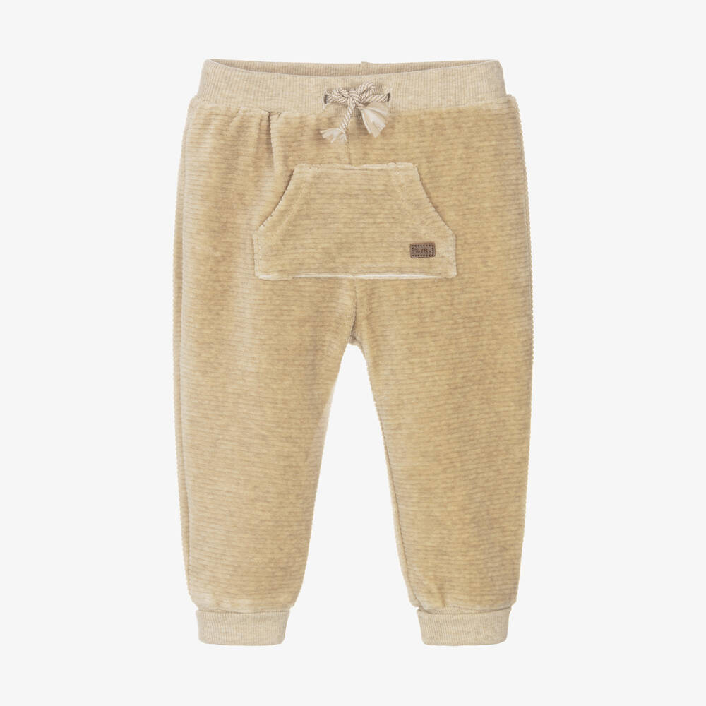 Beige joggers for baby boys and girls by Mayoral, made in softly textured corduroy. They have an adorable pouch pocket on the front and decorative ties on the stretchy waistband. The ankle cuffs are gently ribbed for greater comfort.