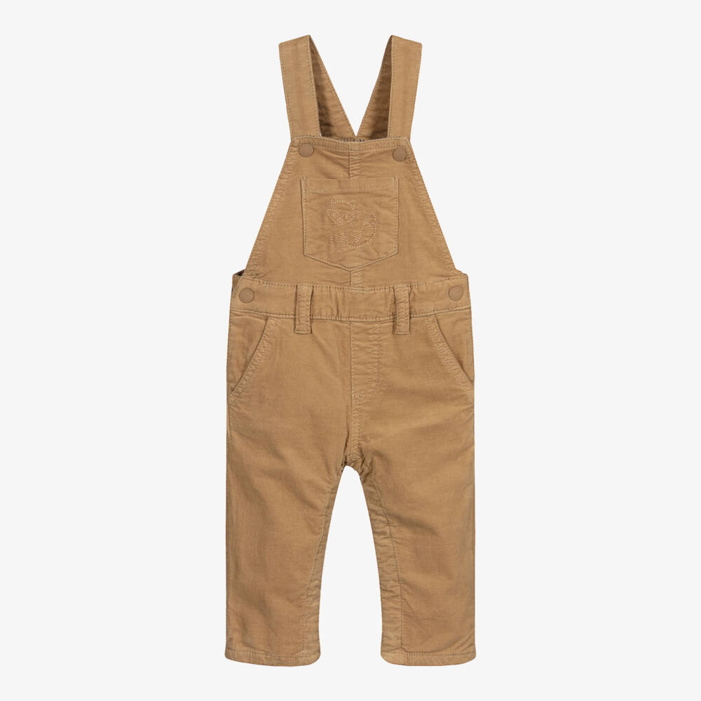Beige dungarees for little boys by Mayoral. They are made in soft cotton corduroy, with a sweet embroidered fox motif on the front. They are lined in comfortable jersey and fasten with poppers on the sides and shoulder straps.