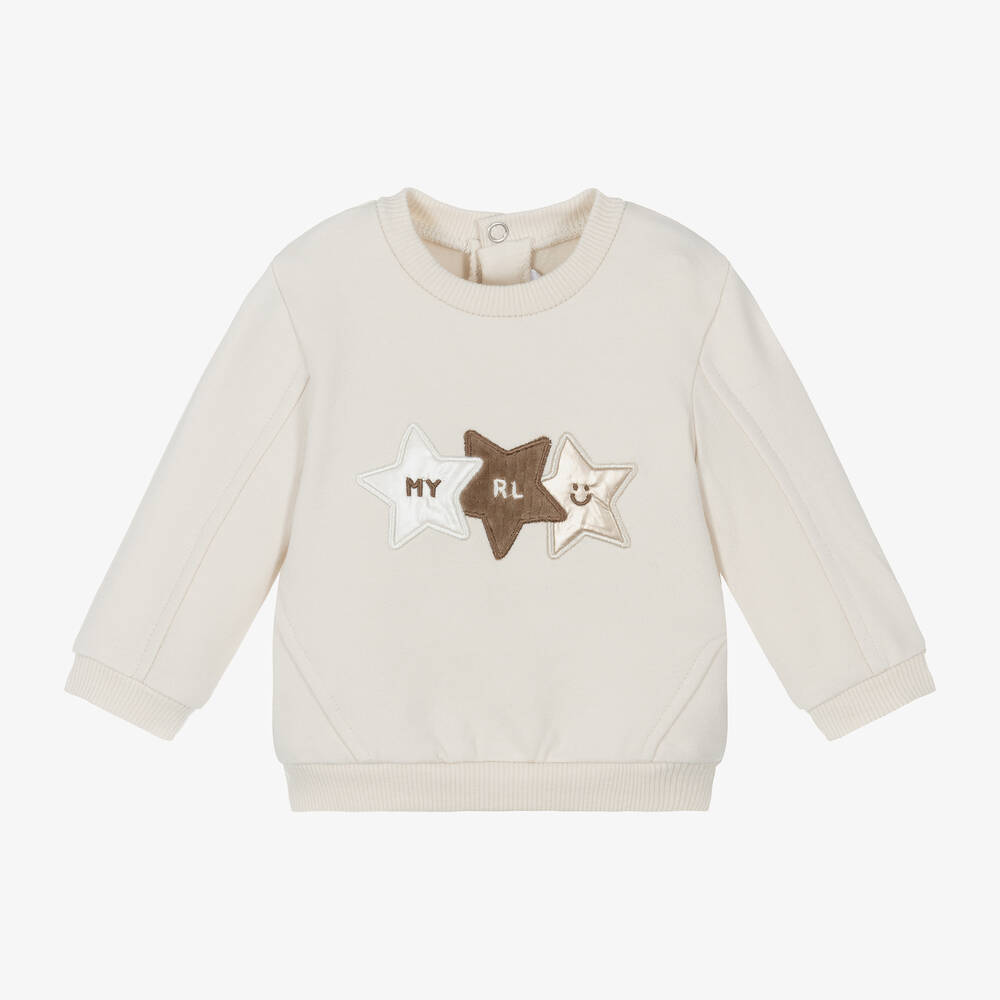 Pale beige cotton sweatshirt for baby boys and girls by Mayoral. This comfortable casualwear is made in soft jersey with a fleecy underside and ribbed trims for extra cosiness. There are tonal logo stars appliquéd in different textured fabric on the front. It fastens with poppers on the back.