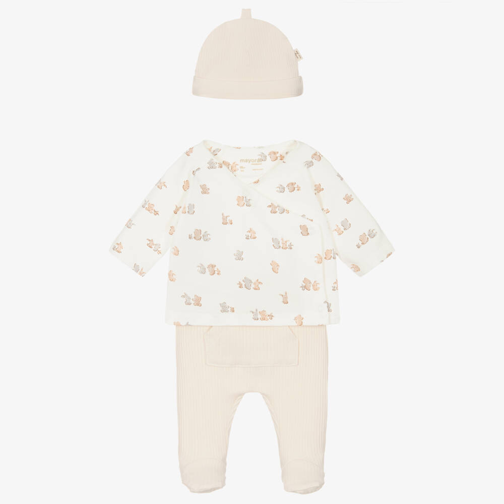 A super cute gift for new arrivals, this beige cotton jersey babysuit set for boys and girls is by Mayoral. Beautifully comfortable, it comprises a front-fastening top patterned with beige bunnies and bears, ribbed, pull-on trousers and a coordinating hat.