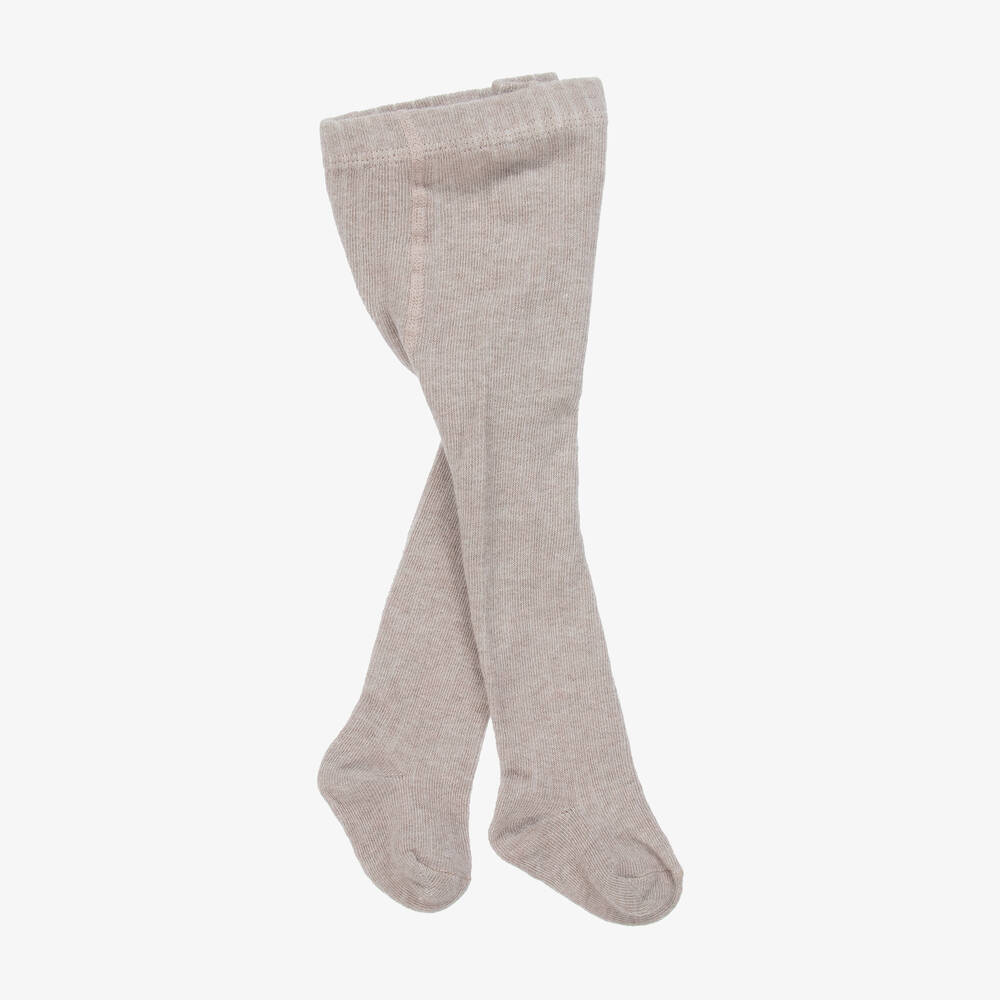Beige ribbed tights for baby boys and girls by Mayoral, knitted in a soft and stretchy organic cotton blend. They have a gently ribbed waistband for a comfortable fit.