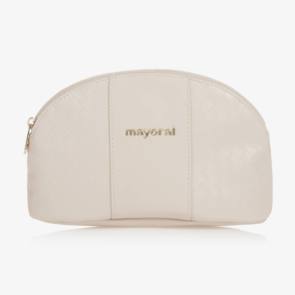 Lovely beige pouch for boys and girls from Mayoral, made in smooth faux leather in an embossed weave pattern. Zips-up across the top with a flat base, this practical, multipurpose accessory can be used as a wash bag or to carry your little one's essentials on-the-go. It has a silky, dotty patterned lining and a pale gold logo embossed on the front.