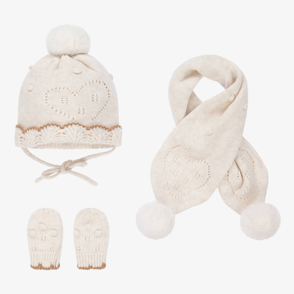 Baby girls beige scarf, hat and mittens set from Mayoral Newborn, knitted in a soft cotton blend. All the pieces have a sweet pointelle design within the knit with crochet details. The hat and scarf are trimmed with faux fur pom-poms. The double layer hat secures under the chin with ties.