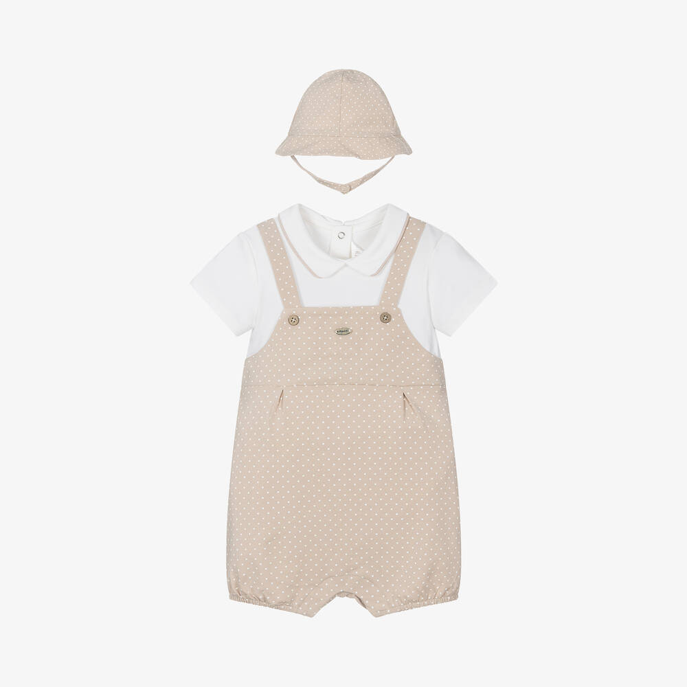 Beige and ivory babysuit set for boys by Mayoral, made from soft and stretchy cotton jersey for comfortable wear. Designed to look like two pieces, the shortie has a smart collar and decorative wooden buttons on the bib front. A subtle logo charm can also be seen on the chest. There are popper fastenings on the back and between the legs to make dressing easier. The small star print matches with the reversible hat for a complete look.