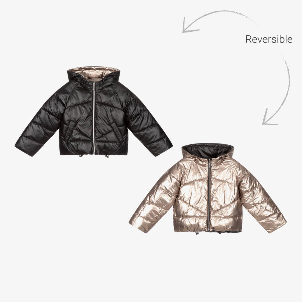 Reversible black and gold puffer jacket for girls by Mayoral, made in recycled fibres. The black side has pockets on the front, whilst the metallic gold side has concealed side pockets. There are drawstrings on the hood and hemline.