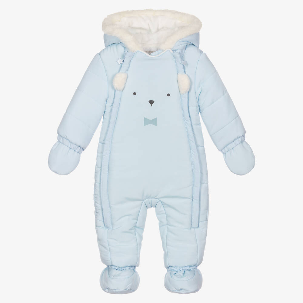 Pale blue snowsuit for baby boys and girls by Mayoral Newborn, with a cute flocked bear face on the front and super soft faux fur ears. Warmly padded in recycled polyester and with a cosy, faux fur-trimmed hood, it is made in silky polyester and lined in soft cotton velour for comfort. There is a double front zip fastening with a popper for easy dressing, and detachable mittens and booties for extra cosiness.