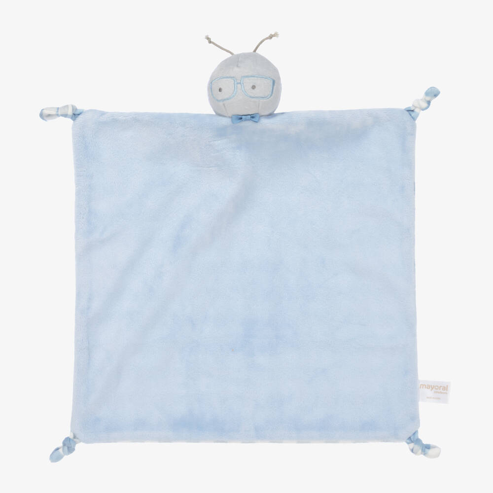 Blue doudou for baby boys by Mayoral Newborn, made in a double layer of soft velour. One side is plain blue and the other has a blue, white and grey checked pattern. It has a cute grey bug's head on the top and knots on each corner.