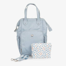 A pale blue changing backpack by Mayoral, combining style with practicality. Made in grained faux leather, it has a spacious main compartment with internal pockets and a further zipped compartment on the front. There are elasticated pockets on the sides, one of which is designed with a velcro flap to easily access wipes. For versatile carrying options, the bag has carry handles on the top, adjustable shoulder straps and two detachable straps for securing to a pram or stroller. It comes with a useful changing mat.