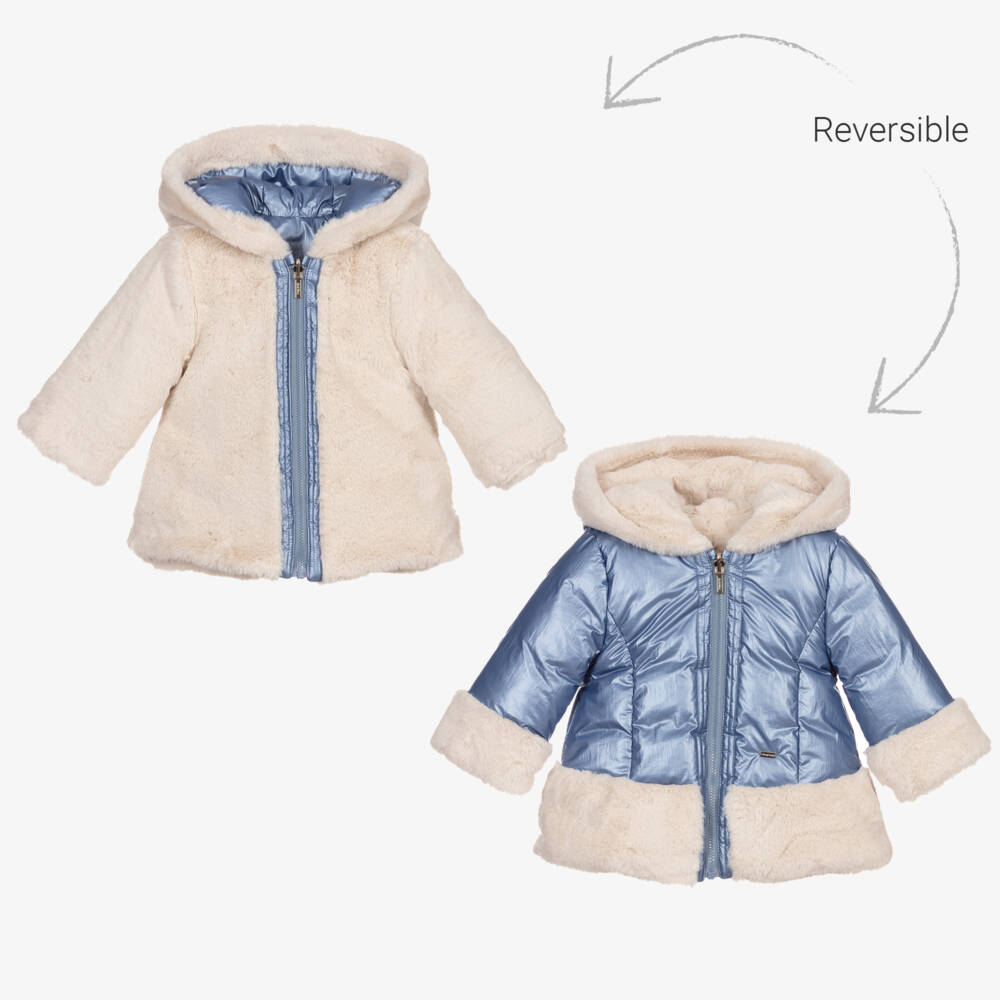 Reversible coat for younger girls by Mayoral, with a hood and cosy recycled padding. The silky pale blue side has a pretty sheen and super soft faux fur trims in beige, with a silver logo tab on one side. The beige side is in matching faux fur with concealed side pockets.