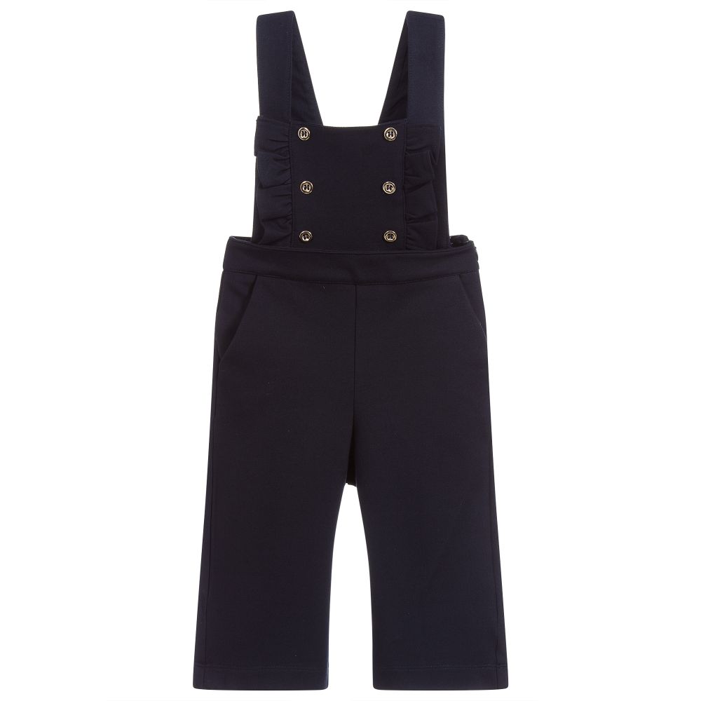 Girls navy blue dungarees by Mayoral, made in a soft viscose blend jersey. They come with a removable bib and braces, with gold buttons and adjustable straps. The bib and straps attach with buttons onto the trousers, which have an adjustable waistband.