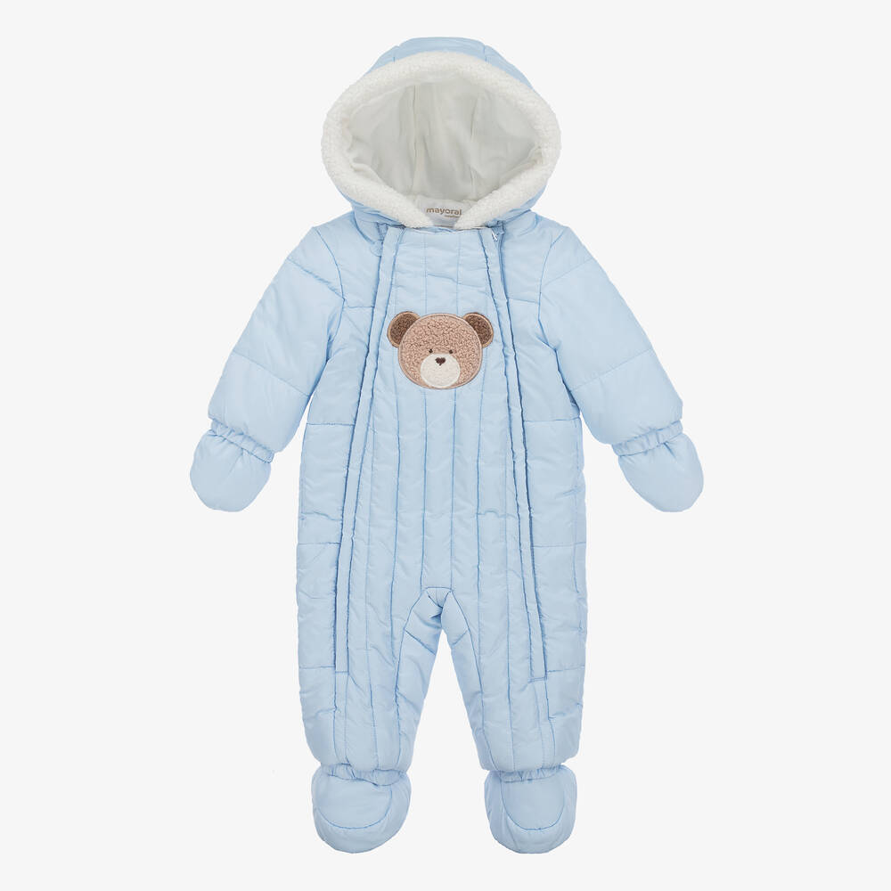Adorable pale blue quilted snowsuit for baby boys and girls from Spanish brand, Mayoral. Silky smooth and warmly padded, it has a soft and comfortable cotton jersey lining and a useful double front zip fastening. For added protection, the neck opening secures with a popper, the cuffs are elasticated, and smaller sizes come with detachable mittens and booties. To complete the cute look, there is an appliqué teddy bear face on the front in soft beige teddy fleece, with a matching ivory trim on the hood.