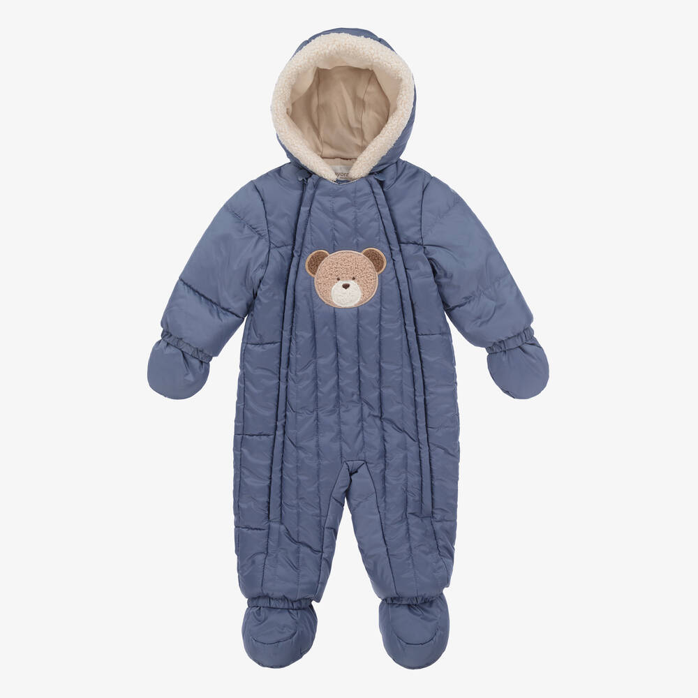 Adorable blue quilted snowsuit for baby boys and girls from Spanish brand, Mayoral. Silky smooth and warmly padded, it has a soft and comfortable cotton jersey lining and a useful double front zip fastening. For added protection, the neck opening secures with a popper, the cuffs are elasticated, and the snowsuit comes with detachable mittens and booties. To complete the cute look, there is an appliqué teddy bear face on the front in soft beige teddy fleece, with a matching ivory trim on the hood.