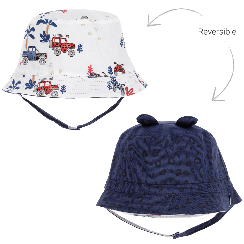 A sweet reversible hat for baby boys and girls by Mayoral, made in soft cotton. One side is navy blue with a leopard print, cute ears and embroidered animal features on top. The other side is white and has an all-over safari print in red and blue. The hat secures with velcro straps under the chin.