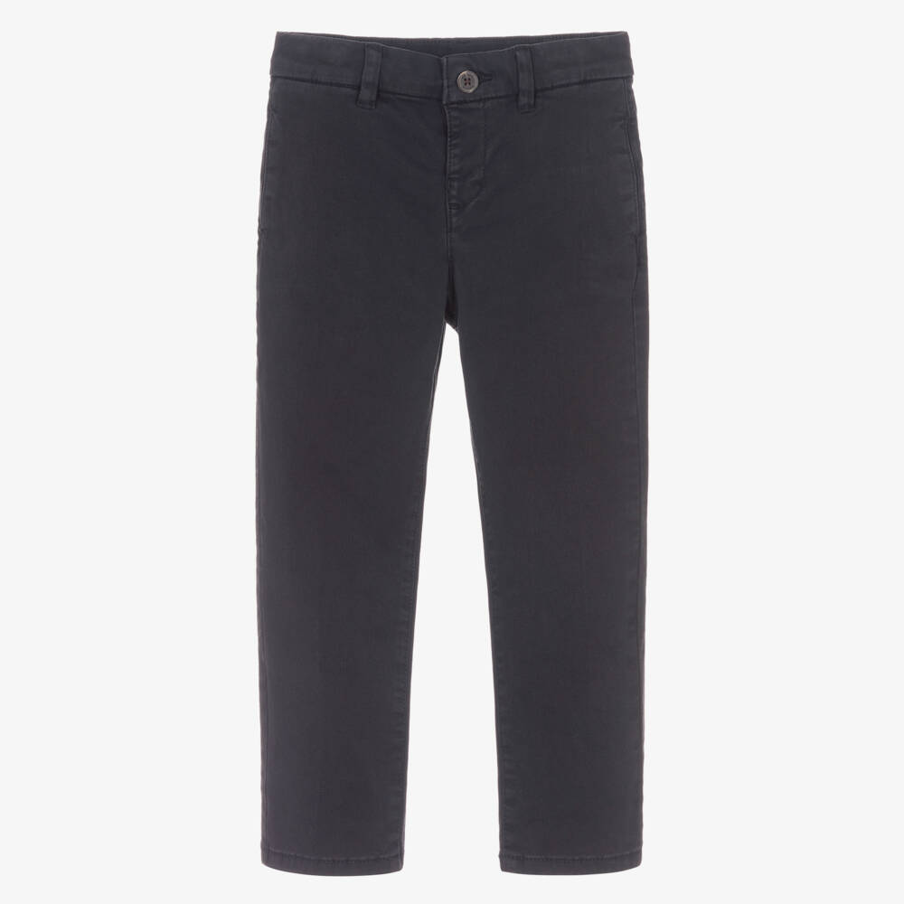 Navy blue, slim fit chino trousers for boys by Mayoral. Ideal for relaxed days, they are made in smooth, comfortable cotton twill and have a classic four pocket style. They have a useful adjustable waistband for a good fit and a branded button fastening on the front. This garment contains sustainable cotton.