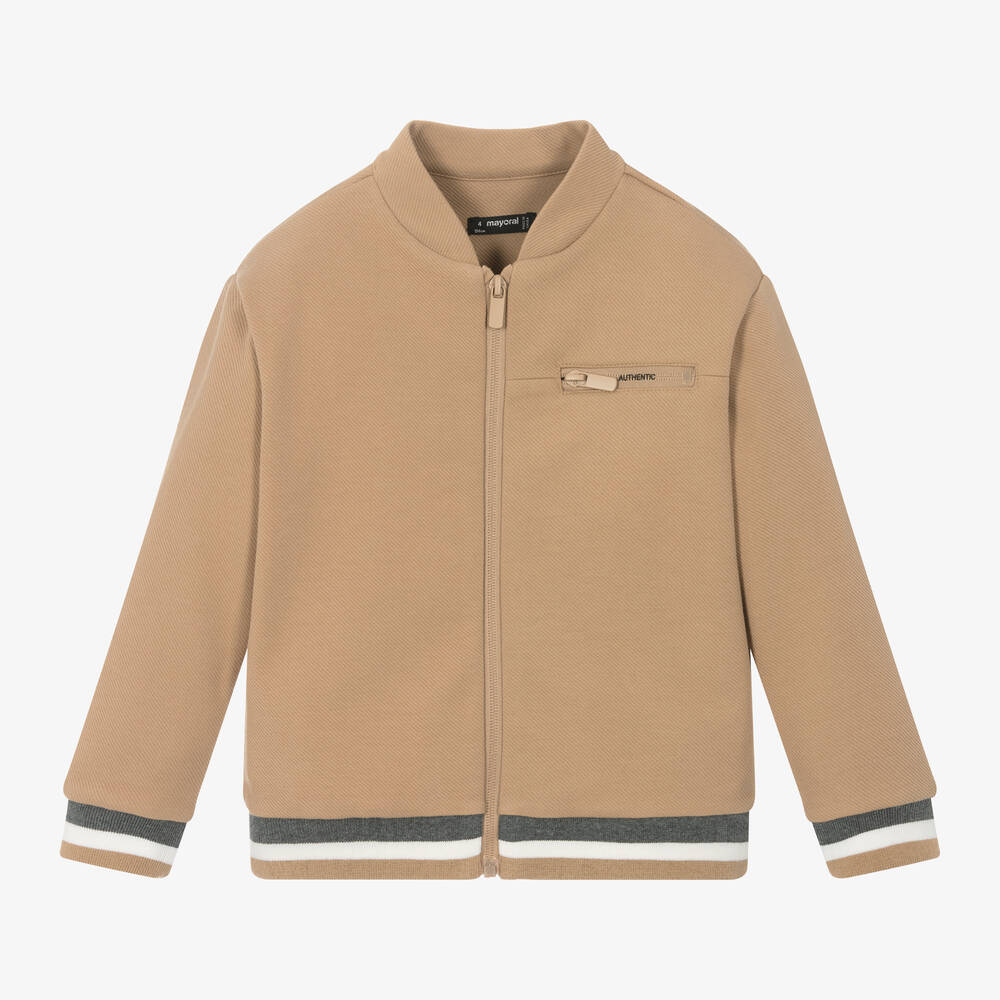 Cool beige bomber jacket for boys by Mayoral, made in soft cotton-blend jersey. Trimmed with sporty stripes, this lightweight layer fastens with a tonal beige zip on the front and has 'Authentic' stamped on the zip-up chest pocket.