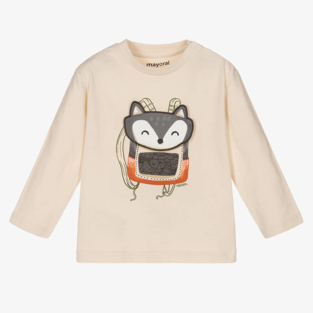 Little boys beige sustainable cotton top from Mayoral. Made in very soft, stretchy brushed jersey, this long-sleeved top has a fun interactive fox backpack motif with a camera and notebook print beneath the soft fabric flap. There are popper fastenings on one shoulder for ease when dressing.