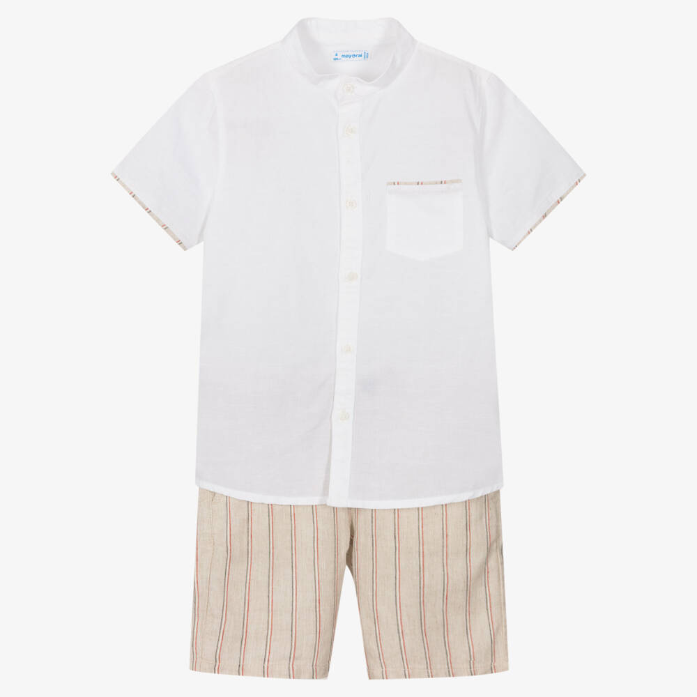 Smart-casual shirt and shorts set for boys by Mayoral, made in a comfortable cotton and linen blend. Patterned in red, black and ivory stripes, the beige shorts have an adjustable drawstring waist and front button fastening. There are useful side and back pockets. The ivory shirt is in a stylish collarless design, with a coordinating, striped trim on the cuffs and on the chest pocket.