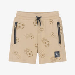 Beige jersey shorts for boys by Mayoral, with a cool football print. Casual and comfortable, they are made in a soft cotton blend and have a drawstring waistband for a great fit. There are useful zipped pockets and a sporty logo patch on one leg to complete the look.