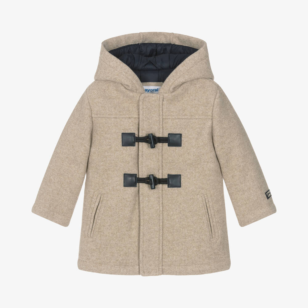A traditional beige duffle coat for little boys by Mayoral, made from a soft felted blend. Lined with quilted satin for warmth, it has classic toggle fastenings which conceal an easy zip closure beneath. Welt pockets on the front complete the style.