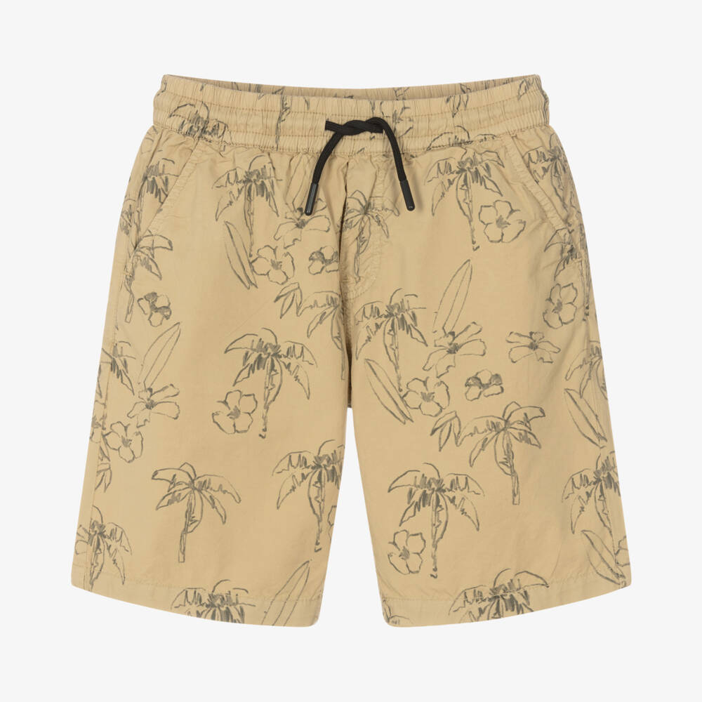 Beach inspired beige shorts for boys from Mayoral Nukutavake. Made in lightweight sustainable cotton twill, they have a slogan patch on the back and an all-over sketched tropical print, with palm trees, flowers and surfboards. They are finished with an elasticated drawstring waist and three useful pockets.