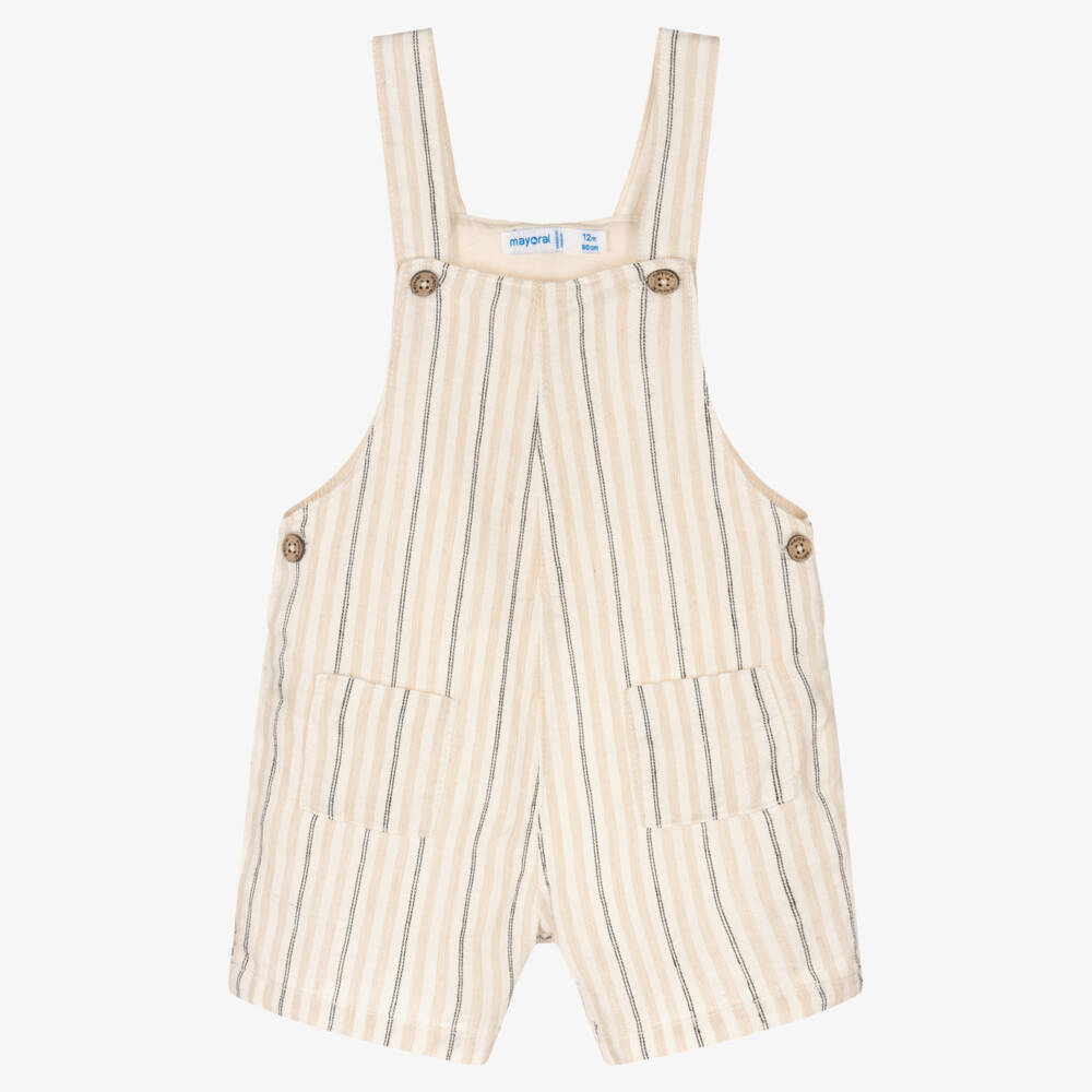 Cute ivory and pale beige short dungarees for little boys by Spanish brand Mayoral, with black stripes. Made in a cool, comfortable, cotton and linen blend, they are just right for relaxed days. They have patch pockets on the front, a faux leather logo tab around the back and fasten with logo buttons on the adjustable straps and sides.