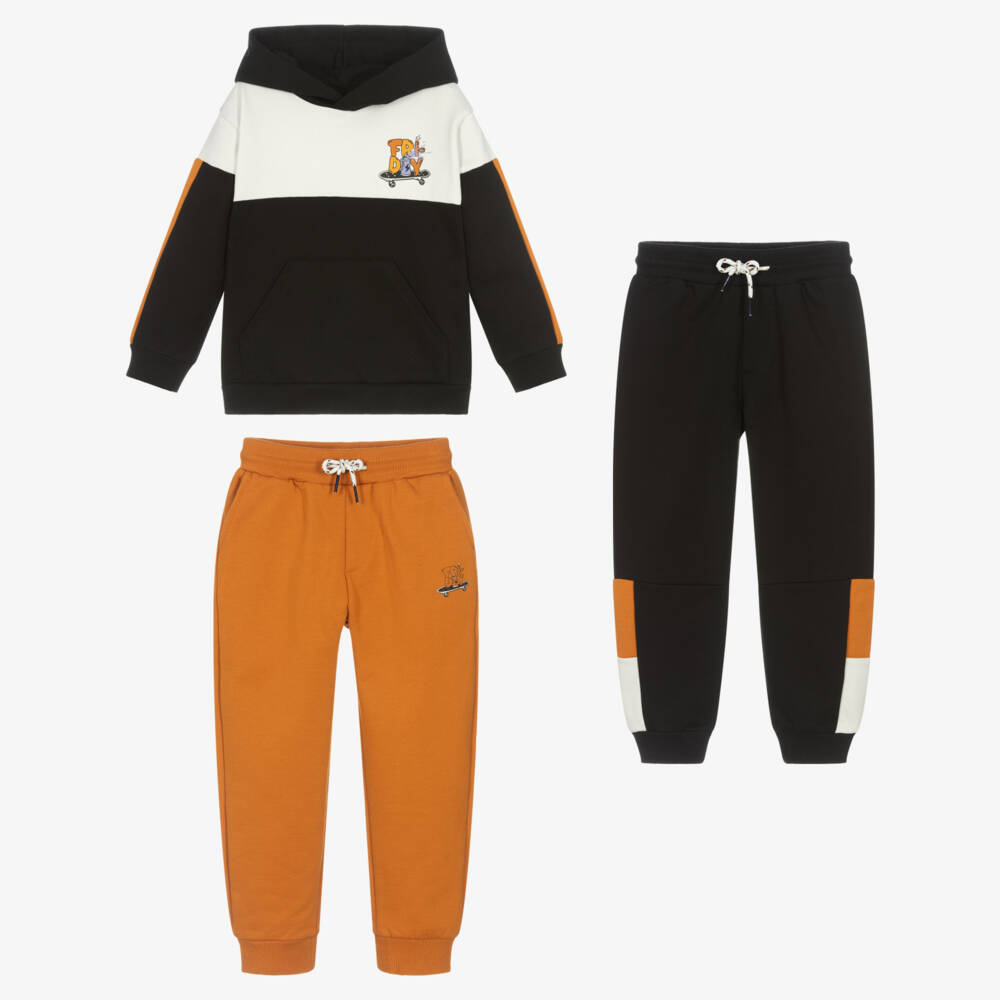 Boys black and ochre brown tracksuit set from Mayoral, printed with 'Friday' lettering on a skateboard. The set is made in soft, mid-weight jersey with a fleecy underside. The black and white colourblock hoodie has a patch pocket on the front. One pair of joggers are black with accent trims and the other pair is ochre brown with a matching print. Both joggers have ribbed cuffs, drawstring waistbands, extra durable knees and pockets.