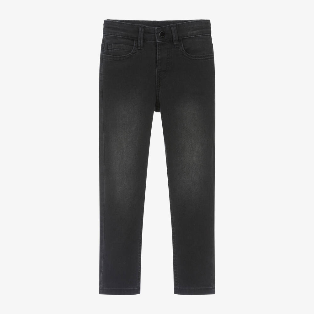 Stylish black jeans for boys by Mayoral, in a slim fit. Designed with a washed and worn look, they have five pocket styling, tonal stitching and a faux leather jacron logo tab on the back of the adjustable waist. For easy dressing, the smaller sizes fasten with simply with a popper and the older sizes fasten with a button and zip.