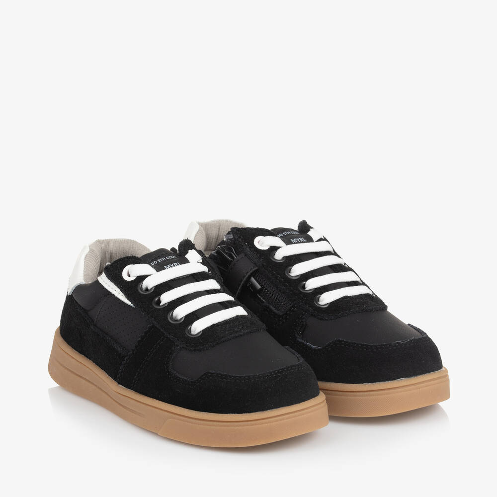 Black trainers for boys by Mayoral, made in soft suede leather with faux leather trims. Lined in soft textile, they have a gently cushioned and breathable leather insole for comfort, which is removable. They have elasticated laces and a practical side zip fastening with a velcro tab. They have a rubberised non-slip sole for good grip with the brand's name displayed on the back of the heel and back of the sole for a subtle designer touch.