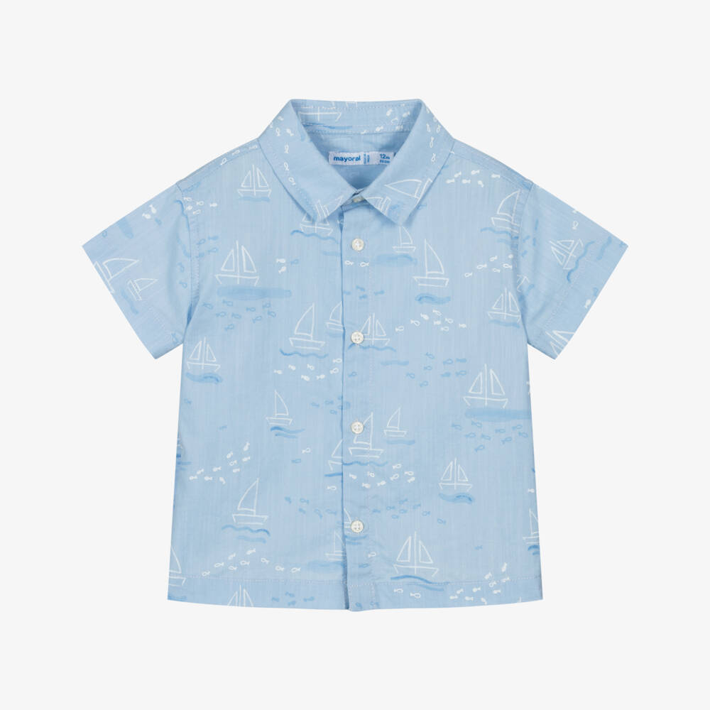 Boys blue short-sleeved shirt by Mayoral. Ideal for sunny days, it has a cute sailing boat print. It fastens with buttons on the front and has a smart, pointed collar.