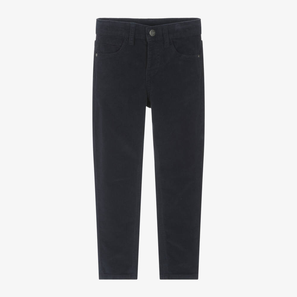 Navy blue trousers for boys by Mayoral, made in soft and stretchy cotton needlecord. Designed with jeans styling, these casual, slim fit trousers have five pocket styling and a grey logo jacron on the back. They fasten with a branded popper and have a useful adjustable waist to ensure a great fit.