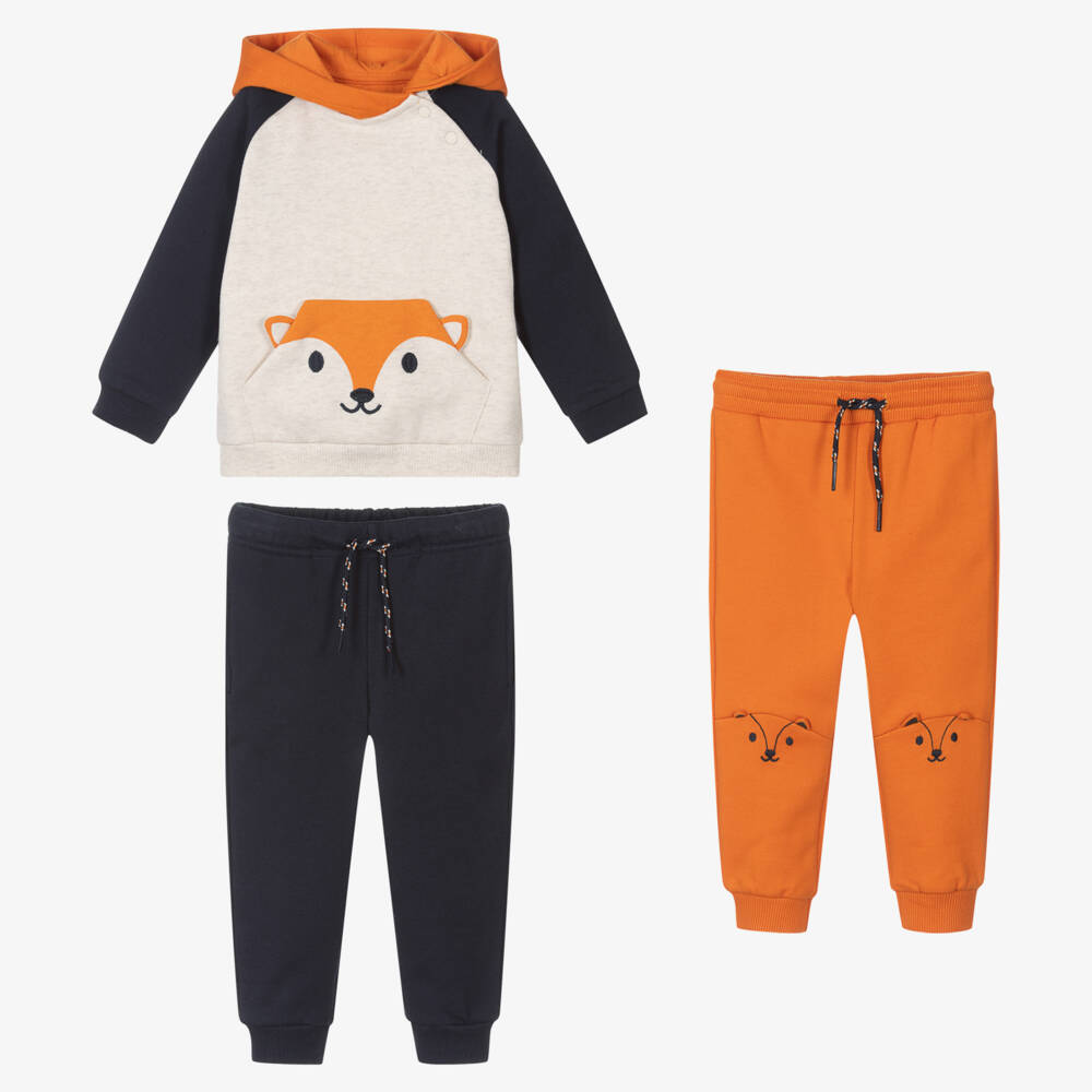 A navy blue and orange three-piece tracksuit for little boys by Mayoral, made from the softest cotton jersey. The light beige hoodie has a sweet fox patterned on the pouch pocket, with popper fastenings on the shoulder for easy changing. The blue joggers have side seam pockets and a single back pocket patterned with a fox. The orange joggers have foxes embroidered on the front. Both pairs are conveniently finished with drawstring waists and durable knees.