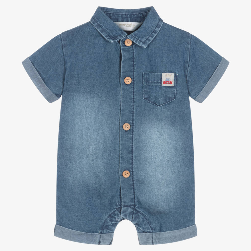 A blue shortie for baby boys from Spanish brand Mayoral. Soft and lightweight, it is made in sustainable cotton chambray with slight stretch for comfort. It has sweet wooden front buttons, fixed fold-over cuffs and a front pocket with a logo label. Useful poppers between the legs ensure quick dressing and changing.