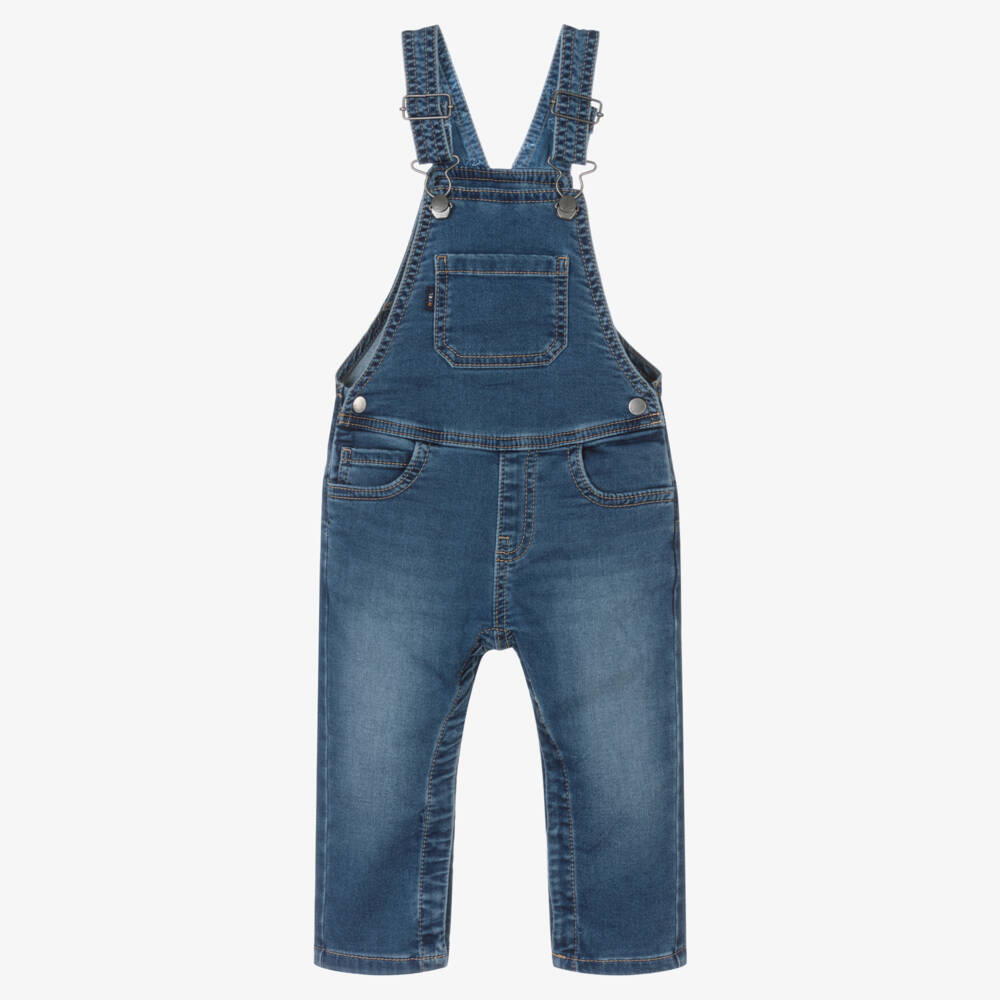 Blue denim dungarees for little boys by Mayoral, made from soft cotton with slight stretch. Great for creating a layered outfit, these dungarees have adjustable clip-fastening shoulder straps and secure with poppers on the waist and between the legs for easy dressing. They have six-pocket styling with logos on the front and back.
