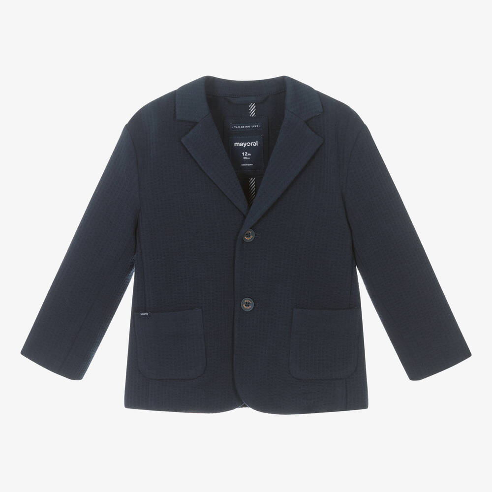 Smart-casual cotton blend navy blue blazer for little boys by Spanish brand Mayoral, made in comfortable jersey with a waffle pattern. It has a navy blue and white striped poplin lining on the collar, with matching trims on the inside of the jacket. There are navy blue logo button fastenings and patch pockets on the front, with a vent around the back to allow extra movement.