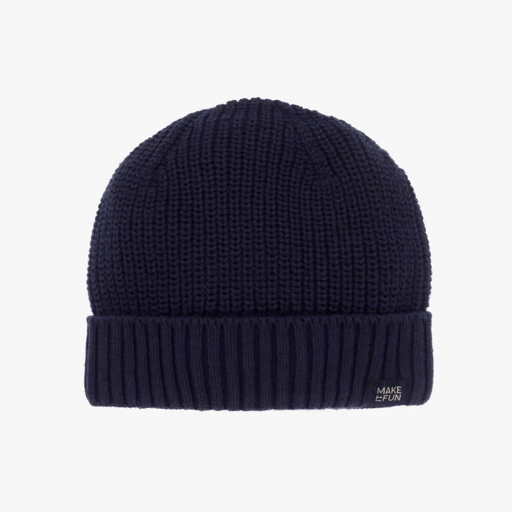 Navy blue beanie hat for boys by Mayoral, knitted in soft cotton in a mid-weight ribbed design. Cosy and comfortable, it has a turned-up brim with a navy blue 'Make It Fun' tab on the front.