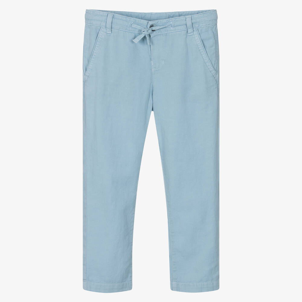 Pale blue relaxed-fit chino trousers for boys by Mayoral, made in lightweight cotton twill. They have an adjustable waist for an ideal fit, with a button and drawstring fastening. They have slanted front pockets and an additional pocket on the back.
