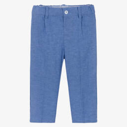 Blue trousers for little boys by Mayoral, made in a lightweight cotton and linen blend. These smart-casual trousers have an adjustable waist for an ideal fit and a simple button fastening at the front.