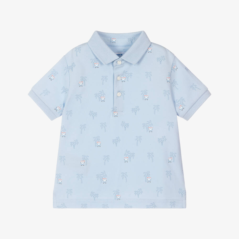 Sky blue polo shirt for little boys by Mayoral, made in soft, breathable cotton piqué. Patterned with campervans and palm trees, this casual polo shirt has neat ribbed trims and a three-button placket.